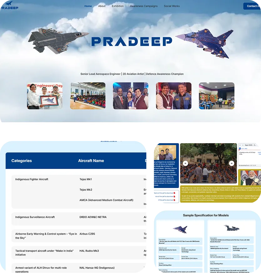 A sophisticated personal website featuring comprehensive professional journey documentation, artistic portfolio showcase, educational campaign presentation, simple yet content-rich design, and meaningful aerospace-themed animations - perfectly capturing the essence of Mr. Pradeep's mission to inspire India's youth toward aerospace, defense, and space excellence.