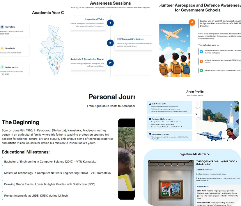 Born on June 8, 1990, in Kalaburagi, Karnataka, Mr. Pradeep leads India's first volunteer-driven aerospace awareness campaign—Igniting Young Minds—which has reached over 23,000 students across Karnataka since 2018. The website showcases his unique blend of aerospace engineering excellence and artistic passion for capturing India's defense and space achievements.